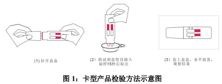 4. 盒型:拉開盒蓋,將試劑盒豎直插入尿樣中(如圖,注意尿樣不要沒過紅線),同時(shí)開始計(jì)時(shí),15 秒后取出并套上盒套,觀察窗向上放置在水平臺(tái)面上。